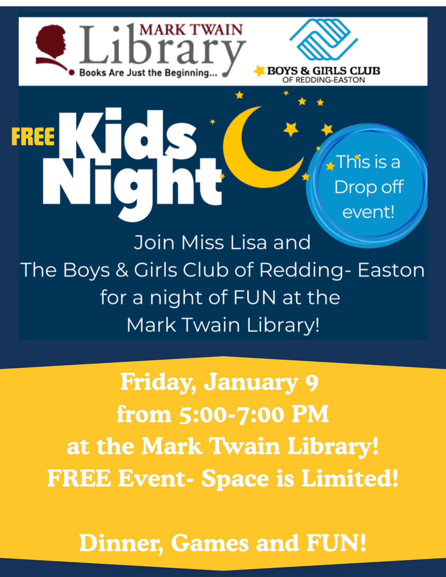 Join Miss Lisa and the Boys & Girls Club of Redding-Easton for a night of FUN at the Mark Twain Library!!!