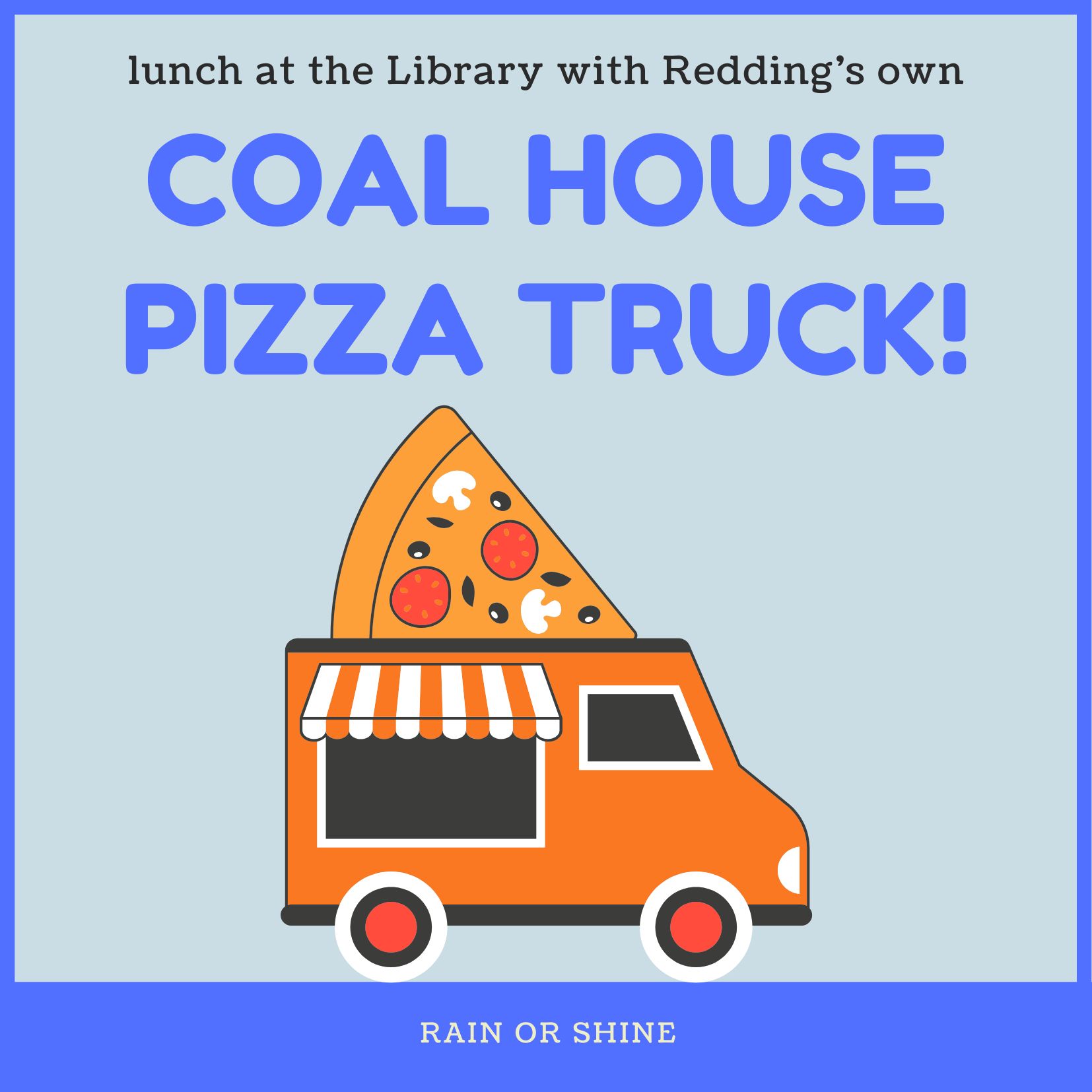 Join us (rain or shine) for Redding’s own Coal House Pizza Truck to visit the Mark Twain Library! The truck will be offering pizza, beverages, and desserts between 11:00am and 3pm.